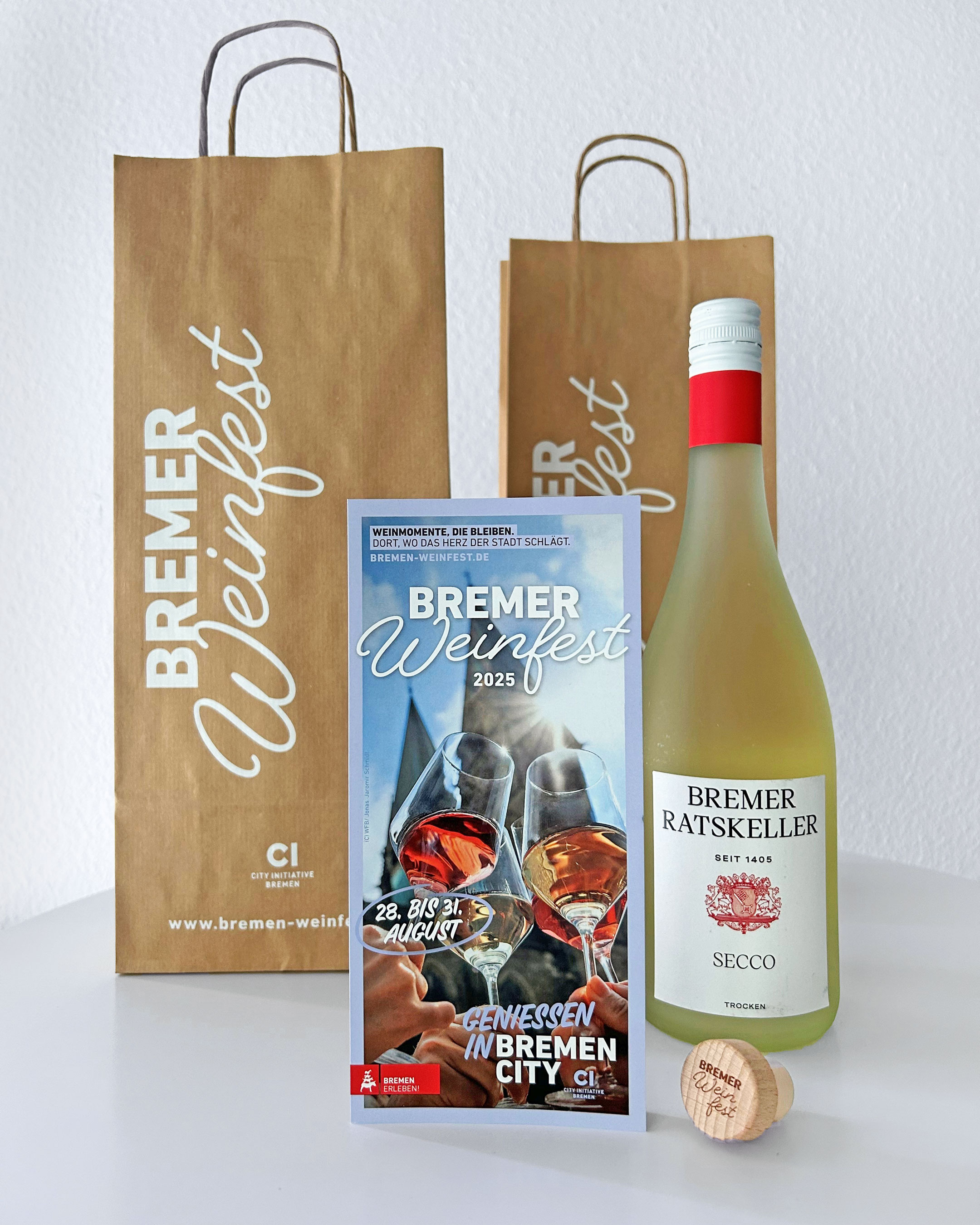 Das Paket beinhaltet u. a. eine Weinflasche eines anwesenden Winzers oder Weinhändlers, ein Weinflaschenverschluss als Erinnerung ans Bremer Weinfest sowie kleine Überraschungen verschiedener Partner, u. a. Gabor aus der Knochenhauerstraße und Gasthof zum Kaiser Friedrich aus dem Schnoor. Also füllt eure Gläser und kommt uns besuchen! Es gilt: solange der Vorrat reicht!