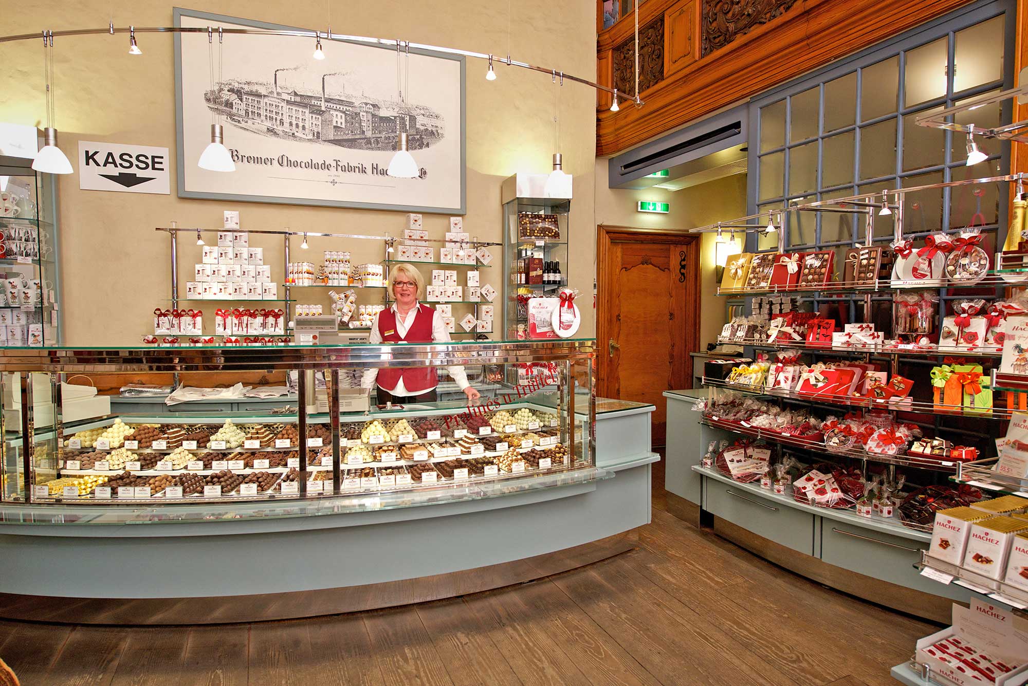 Seit kurzem hat das Hachez-Geschäft in der Bremer Obernstraße nach dreimonatiger Schließung aufgrund eines Wasserschadens wieder geöffnet. Dank umfangreicher Sanierungsarbeiten konnte der historische Charme des Ladens bewahrt werden. Besonders der neue Dielenboden in der Stoevesandt-Diele fügt sich harmonisch in das Gesamtbild ein und verleiht dem Geschäft erneut seinen unverwechselbaren Charakter.