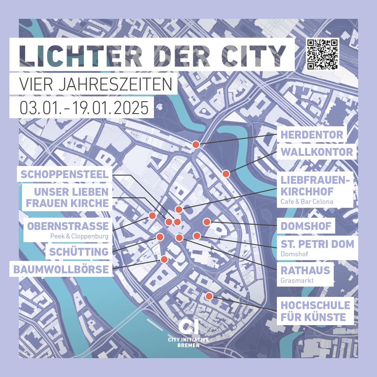 Organisiert von der CityInitiative Bremen Werbung e.V., wird „Lichter der City“ im Jahr 2025 durch die Förderung der Senatorin für Bau, Mobilität und Stadtentwicklung sowie der Unterstützung der Immobilienbesitzerinnen und Immobilienbesitzer ermöglicht.