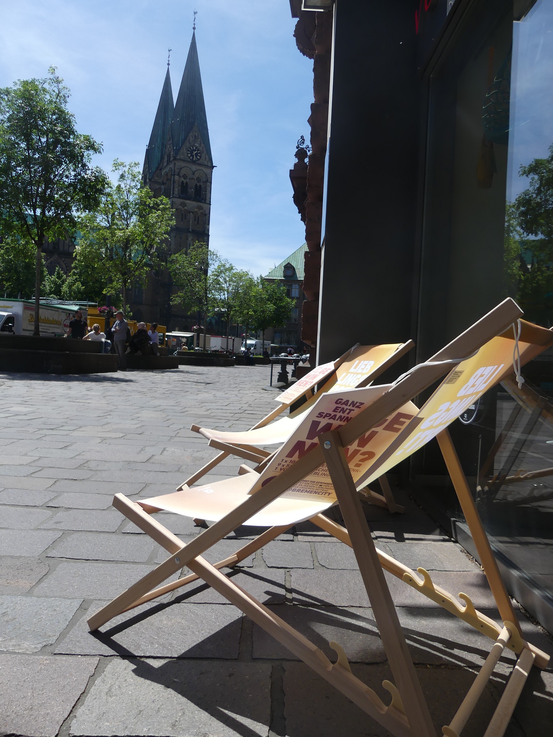Ab dem 16.06.2021 stellen wir 150 bequeme und stylische Liegestühle zur Verfügung, die zum Verweilen am Lieblingsort – Lieblingsgeschäft, Lieblingsrestaurant, Lieblingsmuseum - einladen. Die Liegen finden Sie bei allen teilnehmenden Geschäften in der Bremer Innenstadt.