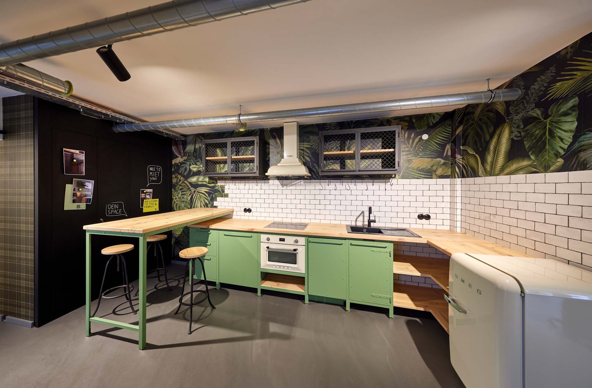Über sieben Etagen erstrecken sich die Räume. Die 1. und 2. Etage sind als Workspaces vorgesehen. Pro Etage können bis zu 20 Personen in einer Art Bürogemeinschaft wahlweise auf ruhigeren Einzelarbeitsplätzen oder in kommunikativen Gemeinschaftsbereichen zusammenarbeiten. In der 7. Etage befindet sich der Konferenzraum. Die Kaffeetheke im 1. Obergeschoss lädt zum kreativen Austausch unter den Nutzer*innen ein und bringt so diverse Charaktere und Arbeitsstile unter einem Dach zusammen.