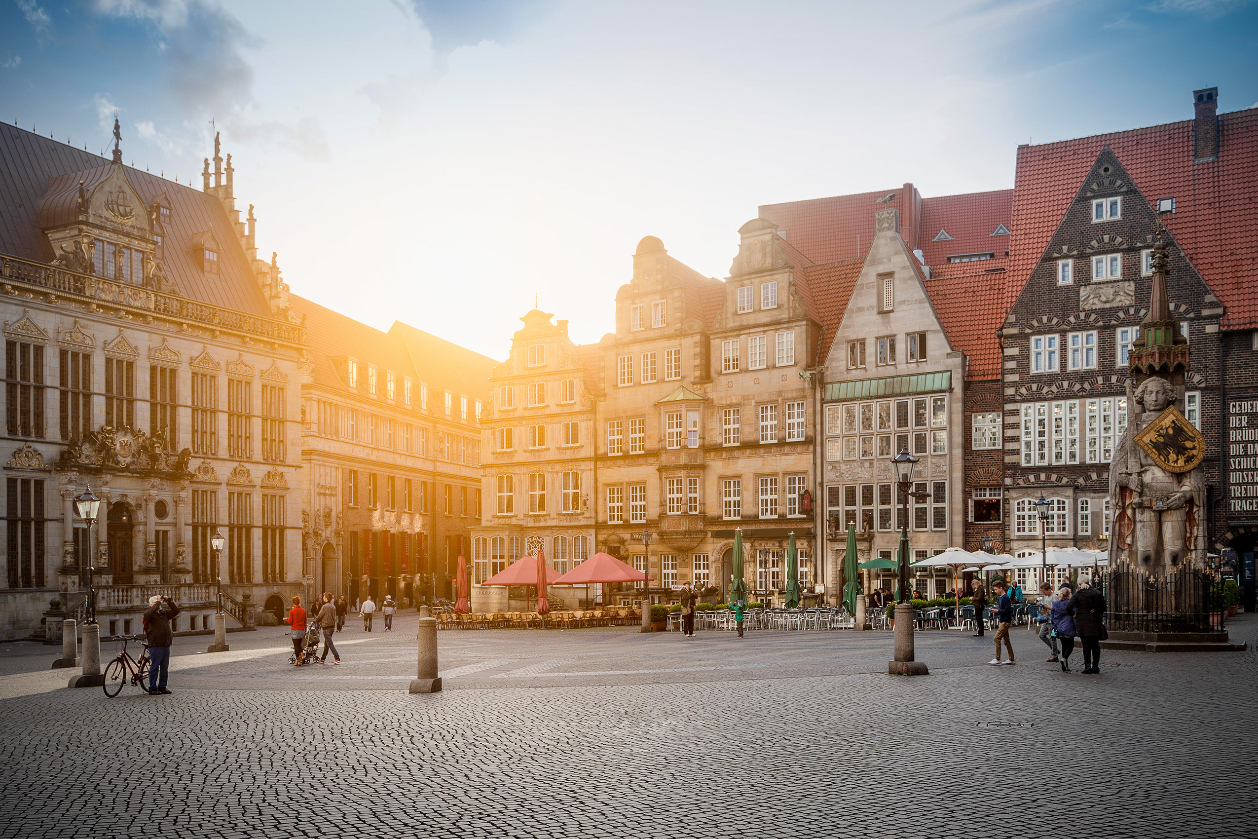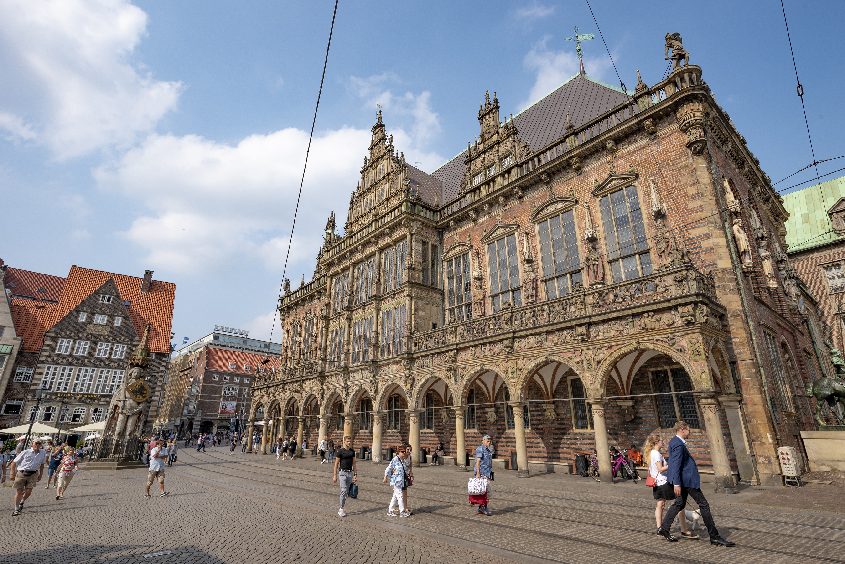 Bremens gute Stube, so nennen die Bremer den Bereich rund um den Marktplatz und das Weltkulturerbeensemble. Mitten drin: Der Roland. Rolandstatuen gibt es viele in Deutschland, aber nur in Bremen steht der schönste Roland. Das sehen nicht nur die Bremer so, sondern auch die UNESCO, die 2004 den Bremer Roland, als Symbol für Freiheit und Marktrecht und das Bremer Rathaus zum Weltkulturerbe ernannt haben. Erbaut wurde das Rathaus ab 1405 im gotischen Stil und erhielt durch den Bremer Baumeister Lüder von Bentheim im 16. Jahrhundert eine neue Fassade im Stil der Weser-Renaissance. Das Bremer Rathaus ist über Jahrhunderte in Baustil und Funktion nicht verändert worden und blieb auch im zweiten Weltkrieg weitgehend unzerstört.